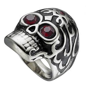 Δαχτυλίδι ανδρικό ατσάλι 316L ασημί νεκροκεφαλή με κόκκινες πέτρες