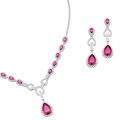 Ασημένιο σετ κοσμημάτων με λευκά ζιργκόν κατασκευής Micro Pave και ρουμπινί πέτρες ζιργκόν. Το σετ περιλαμβάνει σκουλαρίκια και κολιέ