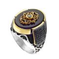 ανδρικό δαχτυλίδι από ασήμι 925 επιχρυσωμένο σκαλιστό με μαύρο αχάτη και μαύρα ζιργκόν