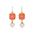 Χειροποίητα σκουλαρίκια Excite Fashion Jewellery με κοραλί τετράγωνο κρύσταλλο και κρεμαστή πέρλα από επιχρυσωμένο ατσάλι S-1725-01-22-7