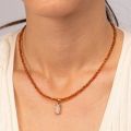 Κολιέ από επίχρυσο ανοξείδωτο ατσάλι της Excite Fashion Jewellery με πορτοκαλί γυάλινες χάντρες και ατσάλινο στοιχείο με μπέζ ζιργκόν. K-1702-01-25-99