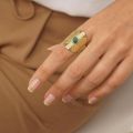 Εντυπωσιακό δαχτυλίδι Excite Fashion Jewellery με πράσινη πέτρα στο κέντρο στολισμένο με ανάγλυφο σχέδιο από επιχρυσωμένο ανοξείδωτο ατσάλι. R-YH455A-G-65