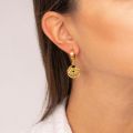 Χειροποίητα κρικάκια Excite Fashion Jewellery, με κρεμαστό ανάγλυφο μοτίφ ματάκι και γυάλινη μάυρη χάντρα, από επιχρυσωμένο ανοξείδωτο ατσάλι. S-1703-01-06-77