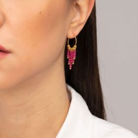 Σκουλαρίκια Excite Fashion Jewellery, κρίκοι από επίχρυσο ατσάλι με κρεμαστές ασύμετρες φούξια και επίχρυσες χάντρες. S-1614-01-32-8