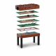 Περιγραφή ποδοσφαίρου: Το πλαίσιο είναι κατασκευασμένο από MDF με επένδυση μελαμίνης σε χρώμα oak γκρι. Το ιδιαίτερο εφέ γρασιδιού δίνει την εντύπωση ότι το παιχνίδι παίζεται σε πραγματικό έδαφος. Οι τελεσκοπικές ράβδοι έχουν διάμετρο 16 mm και είναι επικαλυμένοι με αντισκωριακή βαφή. Για τη γρήγορη και εύκολη ανάκτηση της μπάλας υπάρχει έξοδος πίσω από κάθε τέρμα. Περιλαμβάνονται 3 άσπρες μπάλες. Ευκολότερο σκοράρισμα χάρη στον πλήρως περιστρεφόμενο τερματοφύλακα και το σχηματισμό των παικτών.